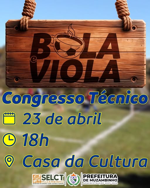 Hoje, quarta-feira, 23/04, às 18h na Casa da Cultura acontecerá o 1º Congresso Técnico do Bola e Viola 2025, onde será discutido o regulamento do campeonato, a confirmação das equipes e a distribuição das fichas de inscrição para o campeonato.