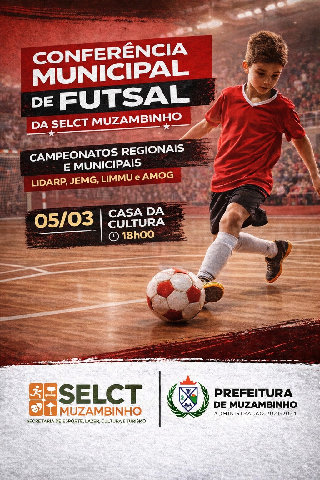 A Secretaria Municipal de Esporte, Lazer, Cultura e Turismo convida toda a população muzambinhense para participar da Conferência Municipal de Futsal, que será realizada no dia 05 de março (quinta-feira), às 18h, na Casa da Cultura de Muzambinho.