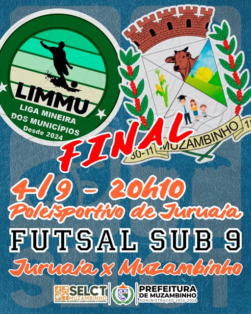 Chegou a hora mais esperada! Hoje, quinta-feira, 4 de setembro, às 20h10, a equipe de Futsal Sub-9 de Muzambinho entra em quadra para disputar a Grande Final do Campeonato da LIMMU 2025. O palco será o Poliesportivo de Juruaia, e o adversário é justamente a equipe da casa.