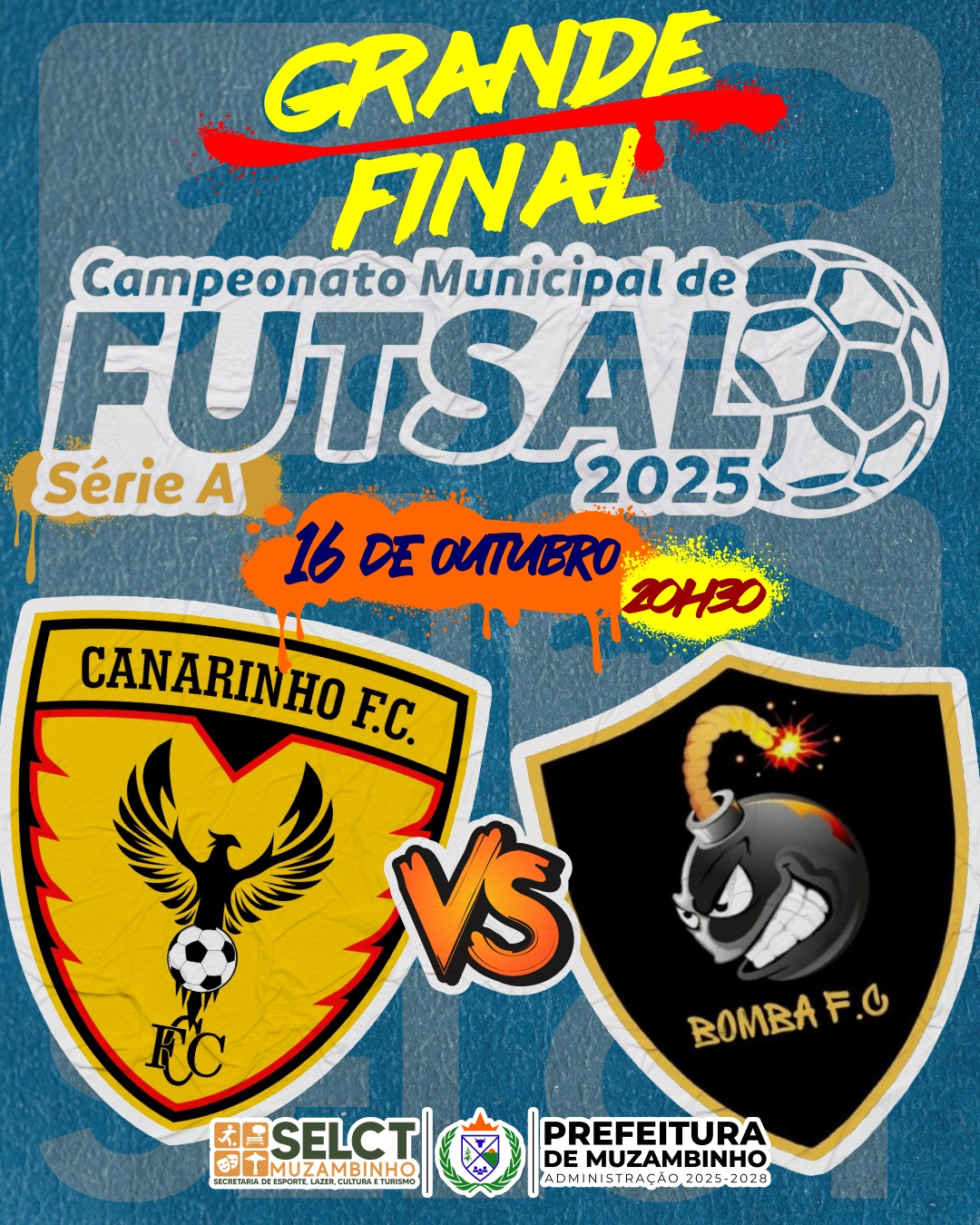 E para fechar a noite em grande estilo, a elite do futsal muzambinhense entra em quadra! O Canarinho, dono da melhor campanha e de um futebol envolvente, quer coroar a temporada com mais um título. Mas o Bomba, conhecido por sua raça e poder de reação, chega com moral após uma semifinal épica decidida nos pênaltis. É duelo de gigantes — técnica contra intensidade, talento contra garra, experiência contra explosão!