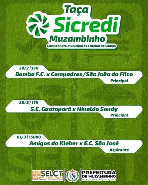 O Campeonato Municipal de Futebol de Campo entra em mais uma rodada eletrizante. O Estádio Municipal Professor Antônio Milhão será novamente o palco das emoções do Campeonato Municipal de Futebol de Campo de Muzambinho neste sábado, 28 de fevereiro, e domingo, 1º de março. A competição entra em um momento crucial, e cada jogo pode fazer a diferença na tabela!