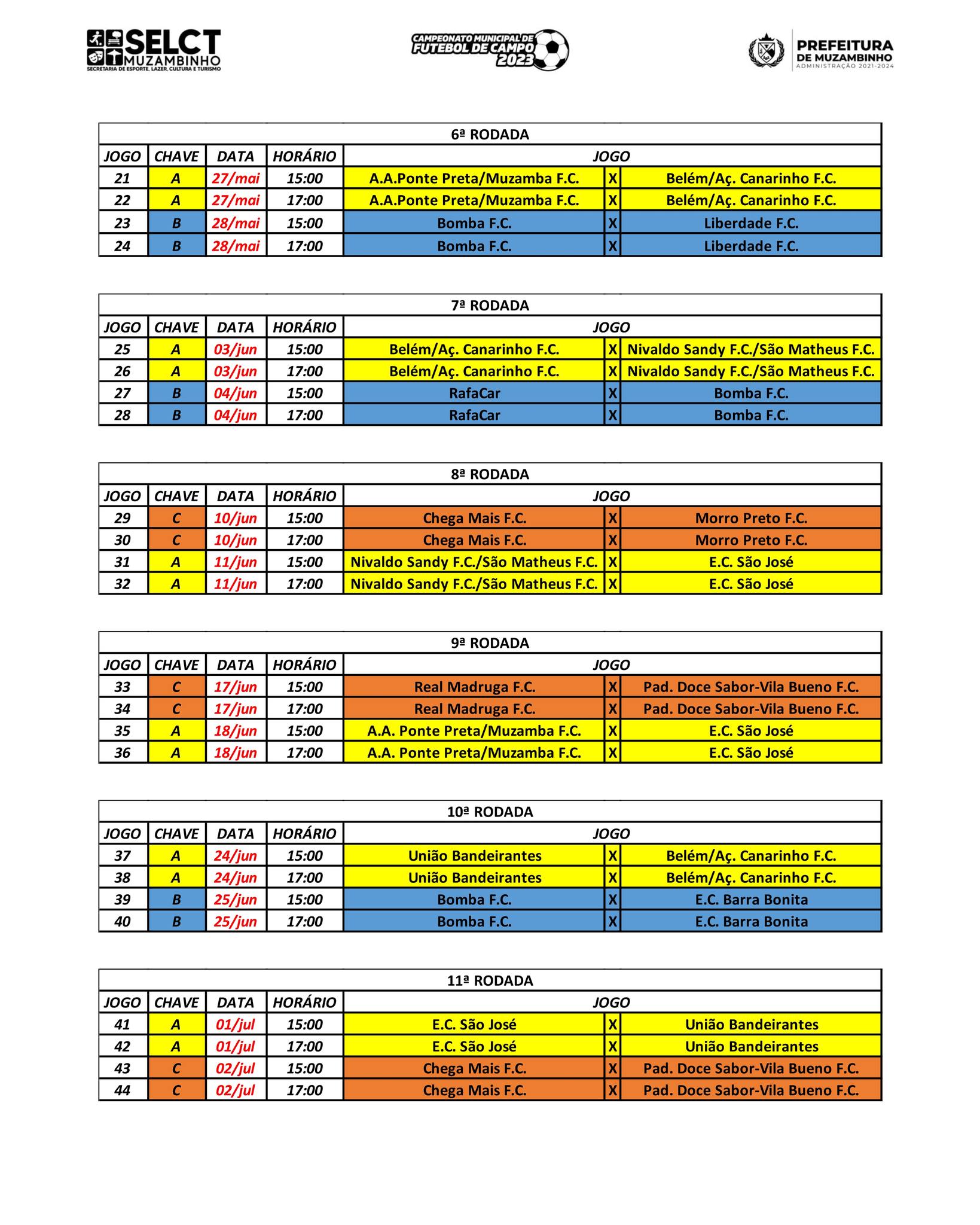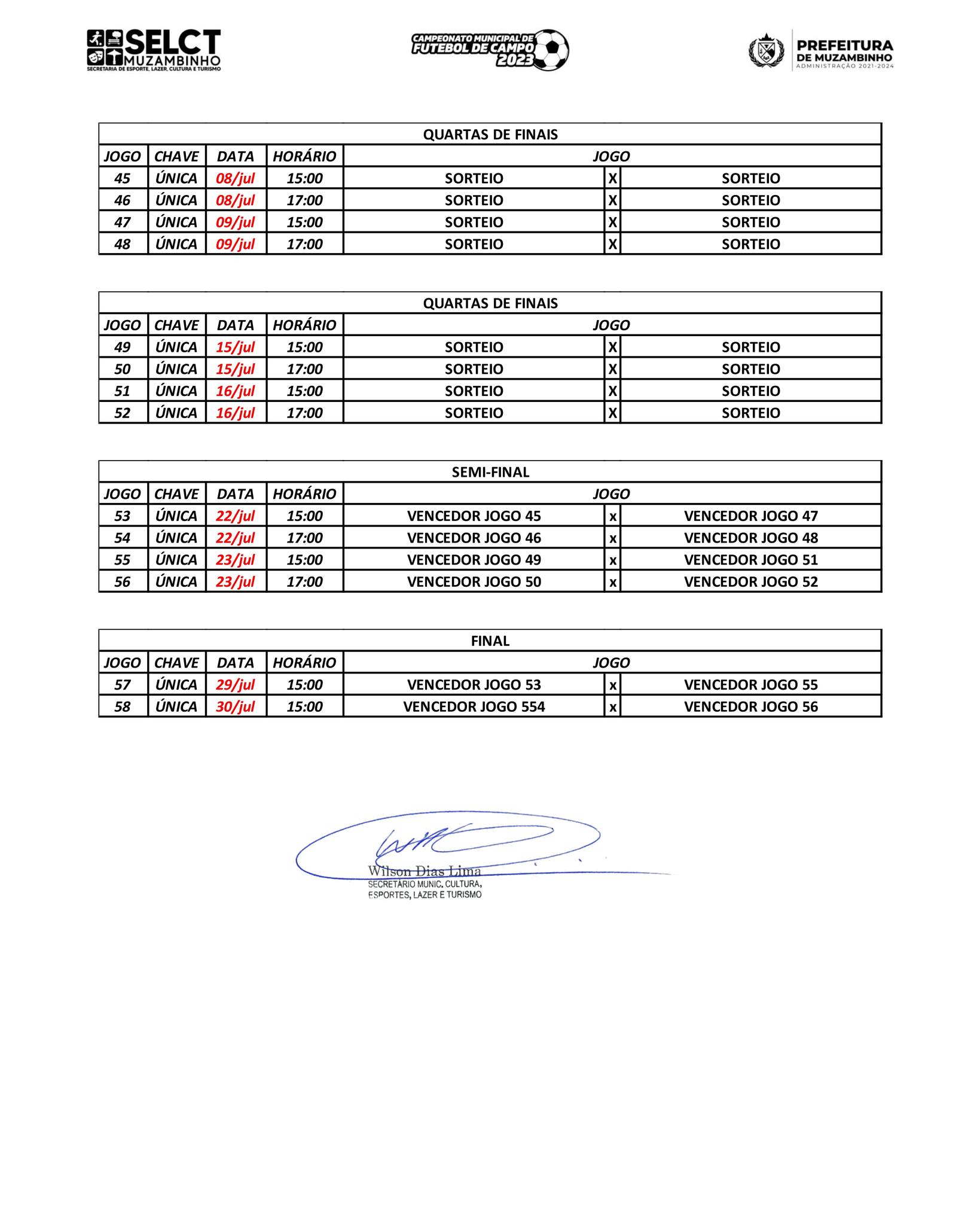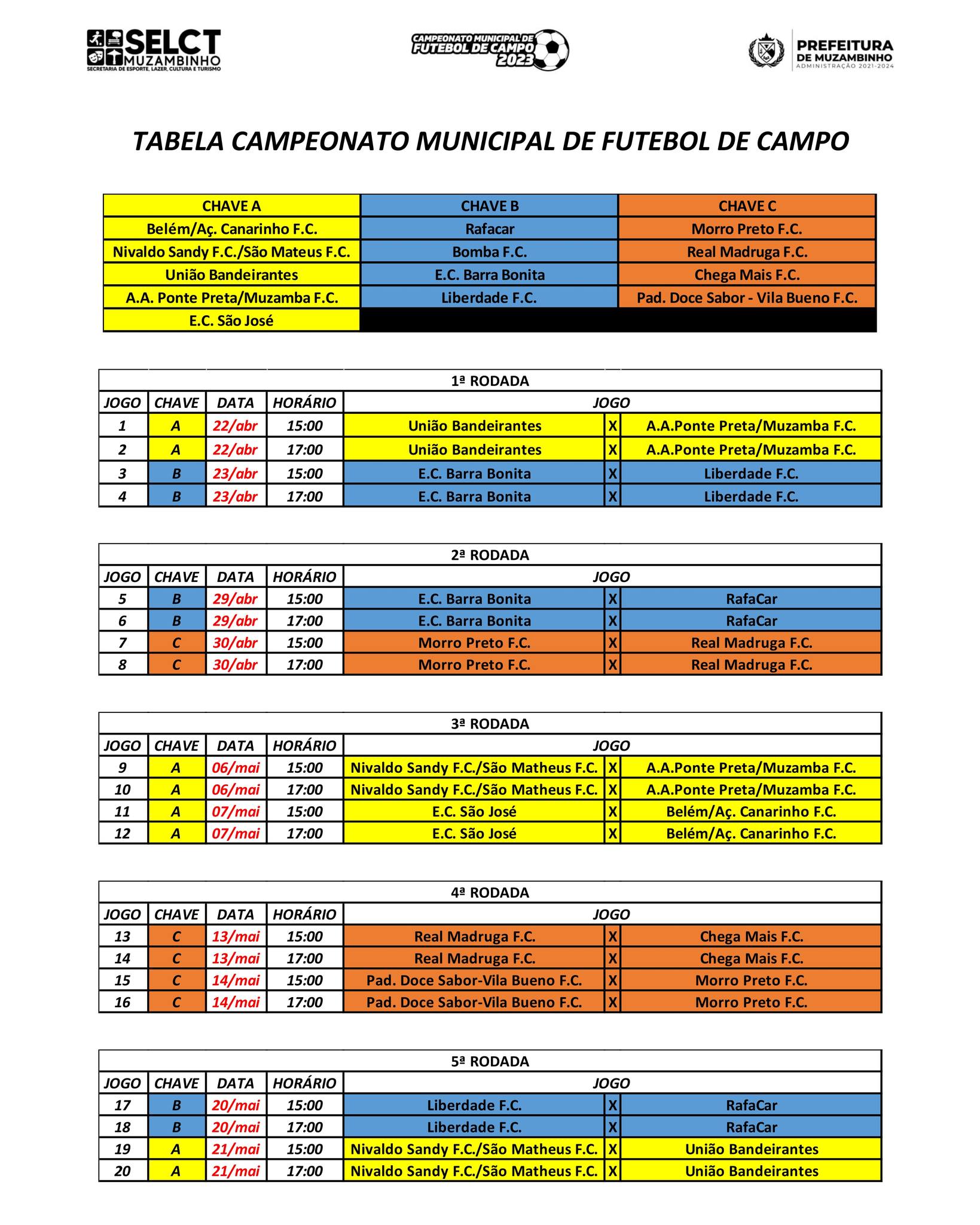 Confira a Tabela do Campeonato Municipal de Futebol de Campo 2023. O Campeonato tem início previsto para o dia 22 de abril e a grande final no dia 30 de julho.