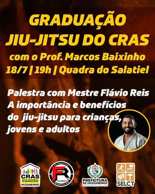 O CRAS de Muzambinho convida a todos para prestigiar a Graduação dos Alunos de Jiu-jitsu do CRAS, com o professor Marcos Baixinho, que será realizada no dia 18 de julho (sexta-feira), às 19h, na Quadra da Escola Estadual Professor Salatiel de Almeida.