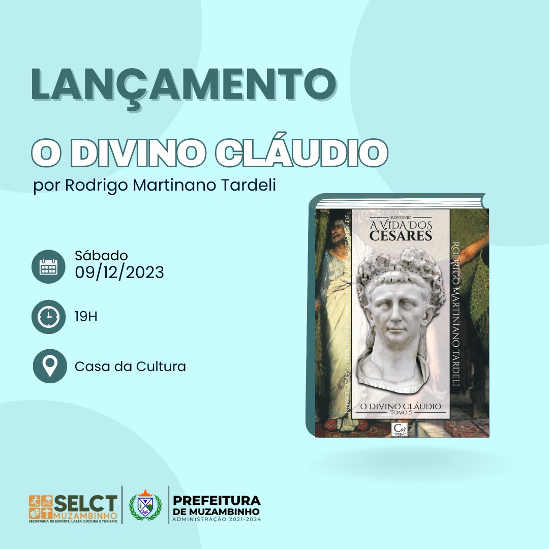No próximo sábado, 09 de dezembro, o professor universitário e escritor Rodrigo Martiniano Tardeli terá a Casa da Cultura de Muzambinho como palco do lançamento em sua terra natal da obra literária “A Vida dos Cesares – O Divino Cláudio”. Será às 19 horas, quando o muzambinhense será prestigiado pelos conterrâneos e um publico regional.