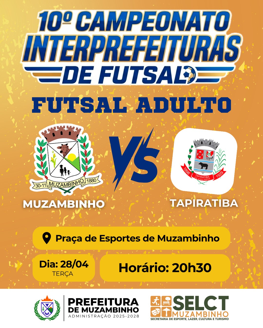 Representando com orgulho o município, a equipe de Muzambinho entra em ação diante de Tapiratiba, em um confronto que promete intensidade do início ao fim. E o melhor: jogando em casa, com o apoio da torcida!