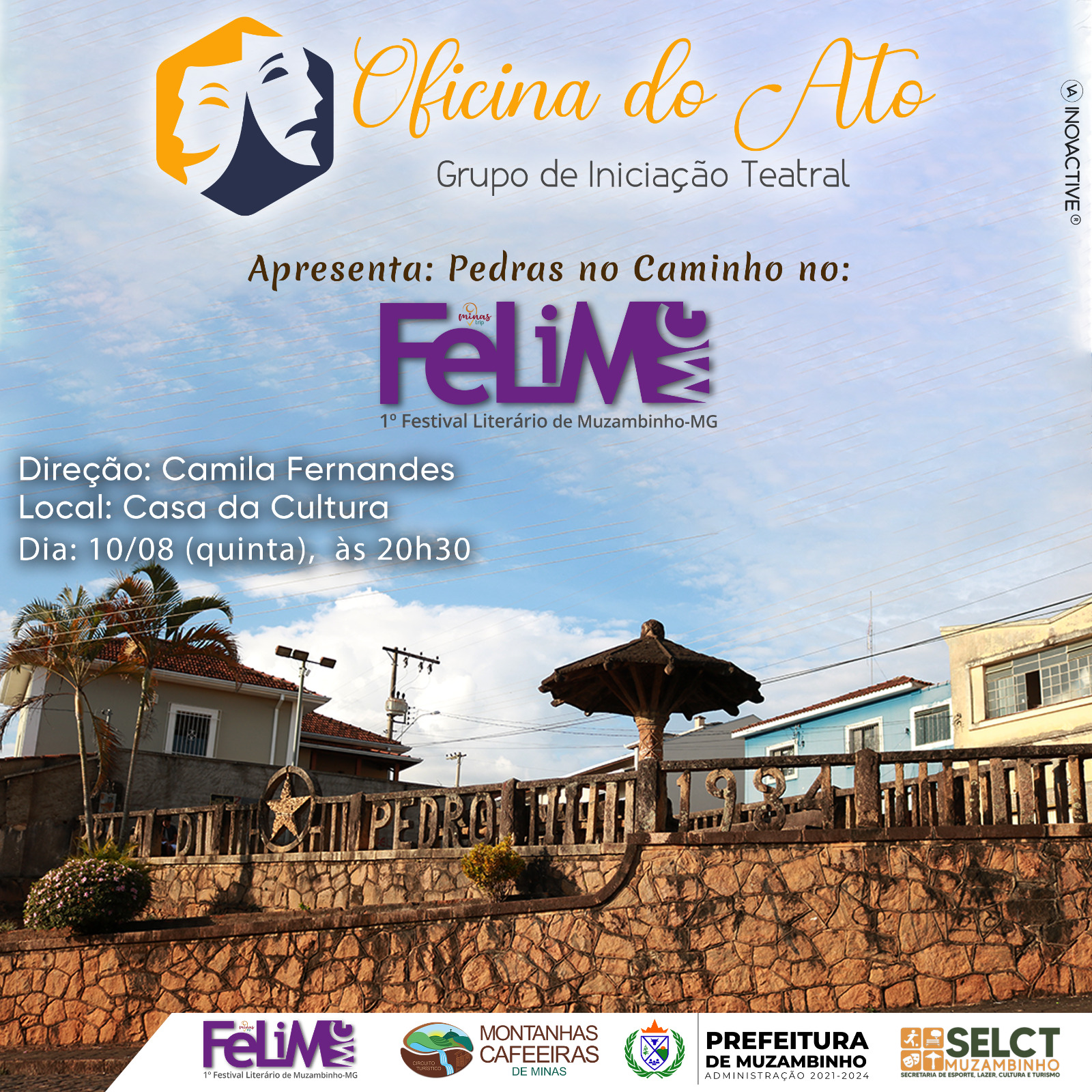 O Grupo de iniciação teatral Oficina do Ato tem a honra de anunciar o espetáculo “Pedras no Caminho” que acontecerá no 1º Festival Literário de Muzambinho – FELIM, entre os dias 7 e 12 de agosto, na Av. Dr. Américo Luz.