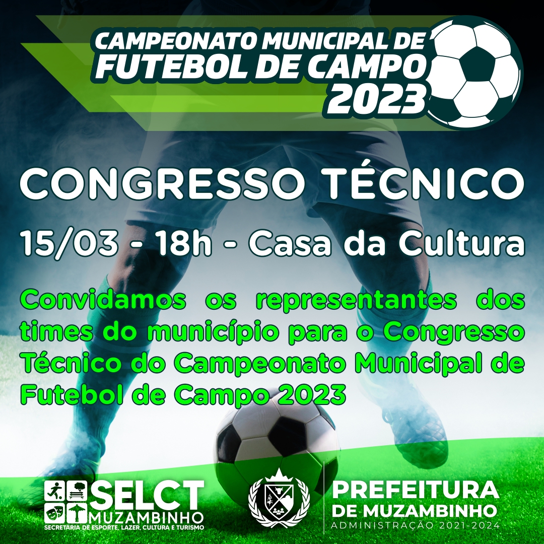 Através de Nota Oficial, a Secretaria Municipal de Esportes, Lazer, Cultura e Turismo (SELCT) de Muzambinho convida os representantes dos times do município para o Congresso Técnico do Campeonato Municipal de Futebol de Campo 2023.