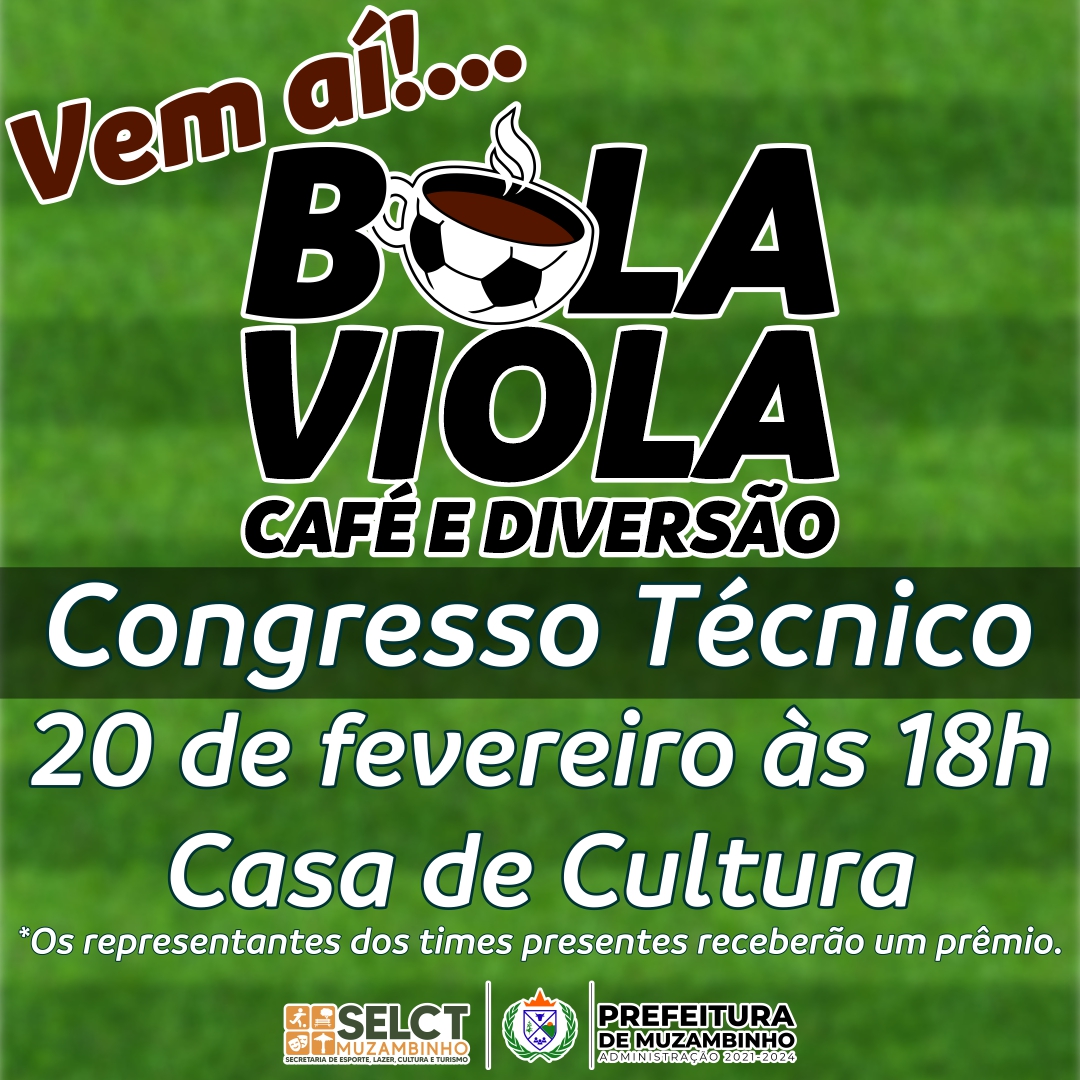 Atenção para o Congresso Técnico do Bola & Viola Café e Diversão em Muzambinho. É na próxima terça-feira, dia 20 de fevereiro, às 18 horas, na Casa da Cultura em Muzambinho. Os representantes dos times presentes receberão um prêmio.