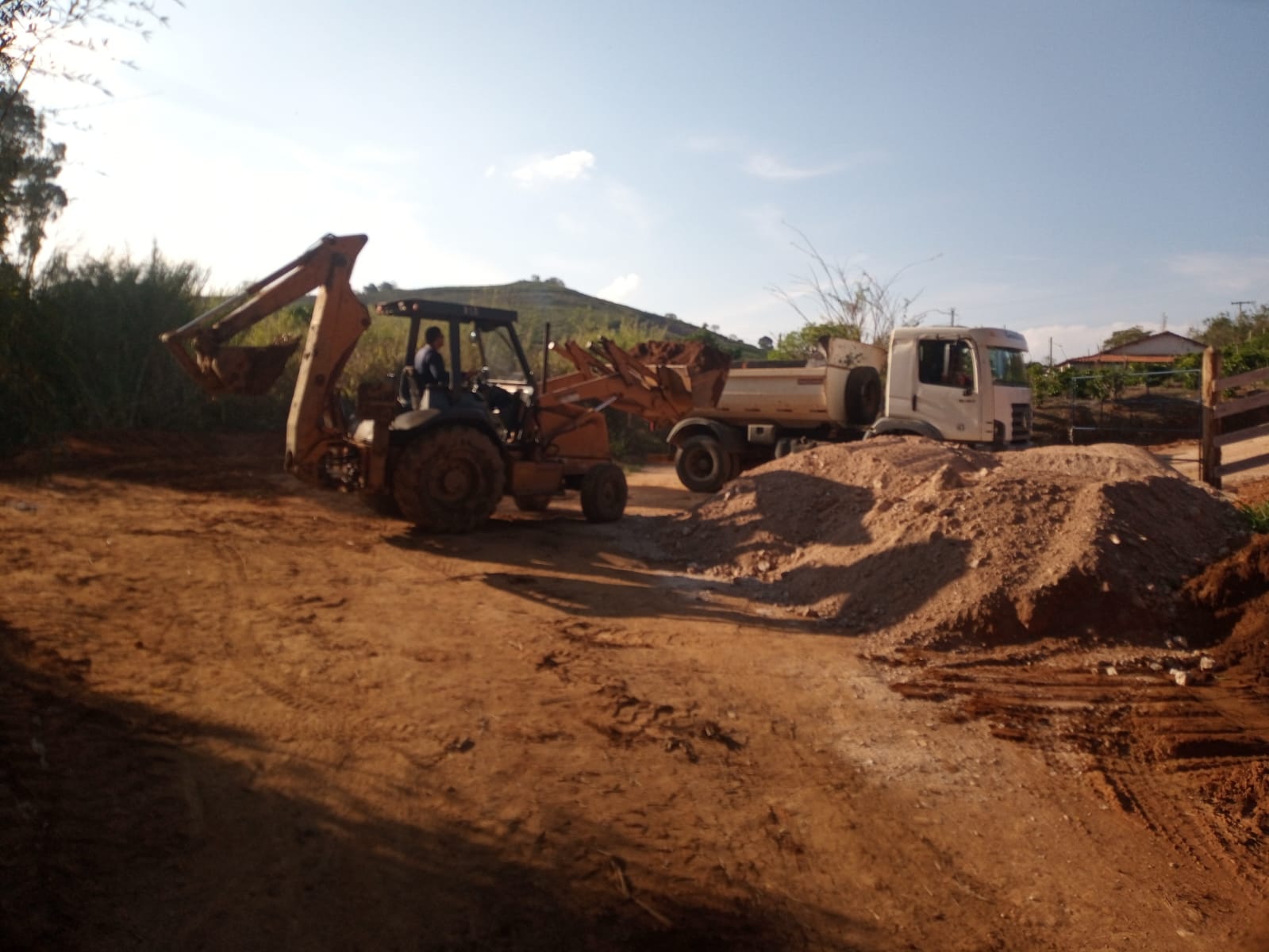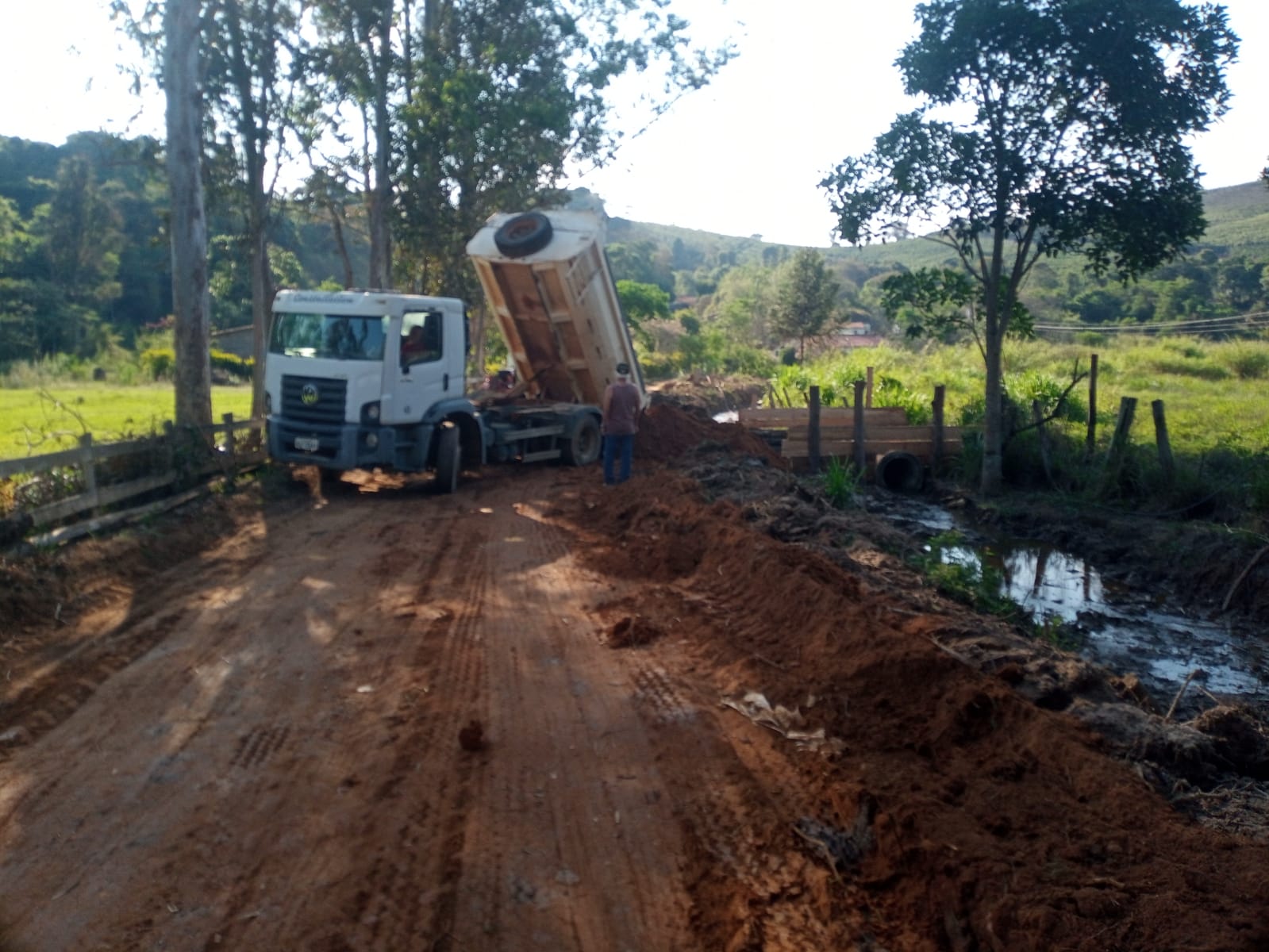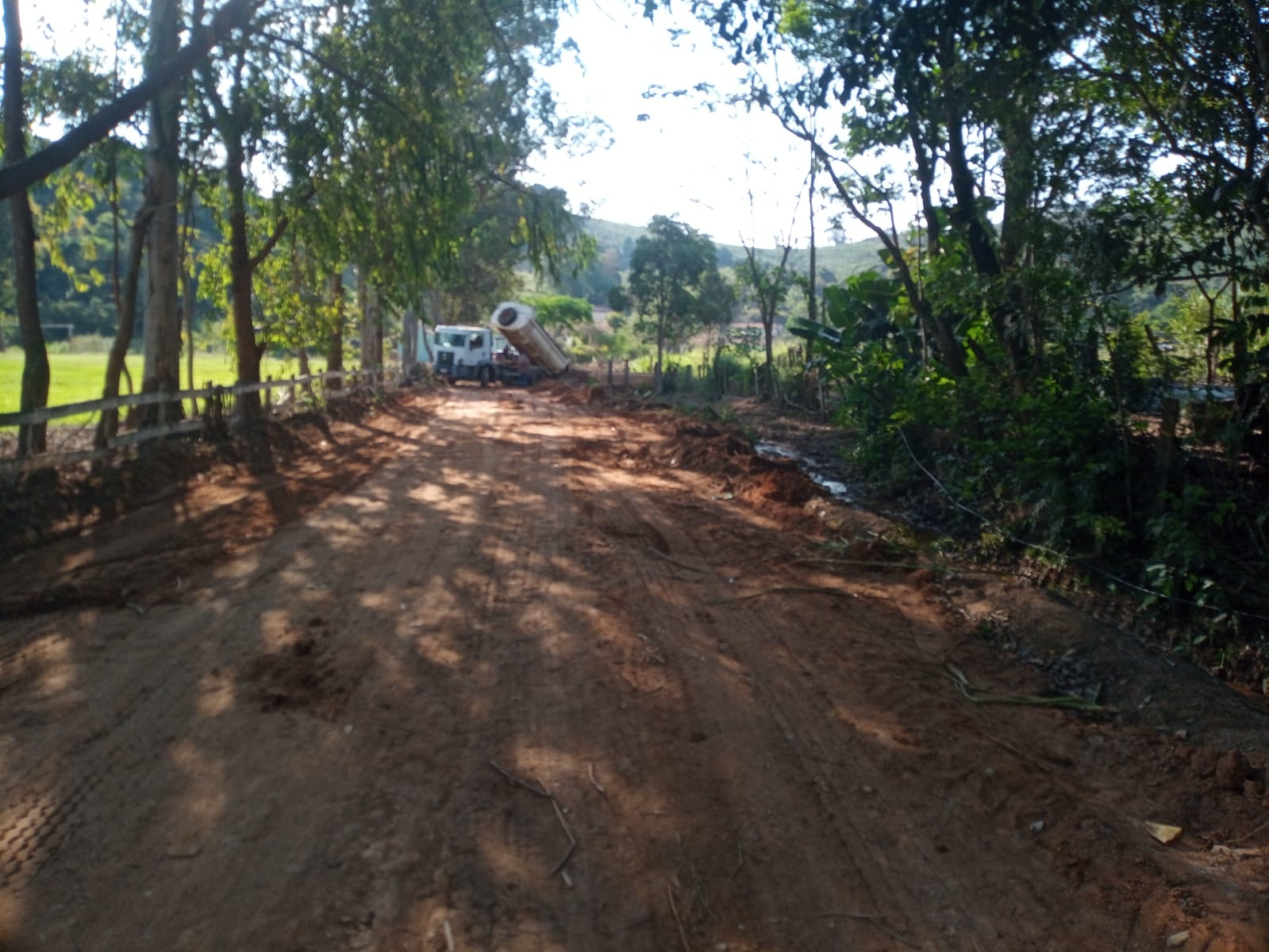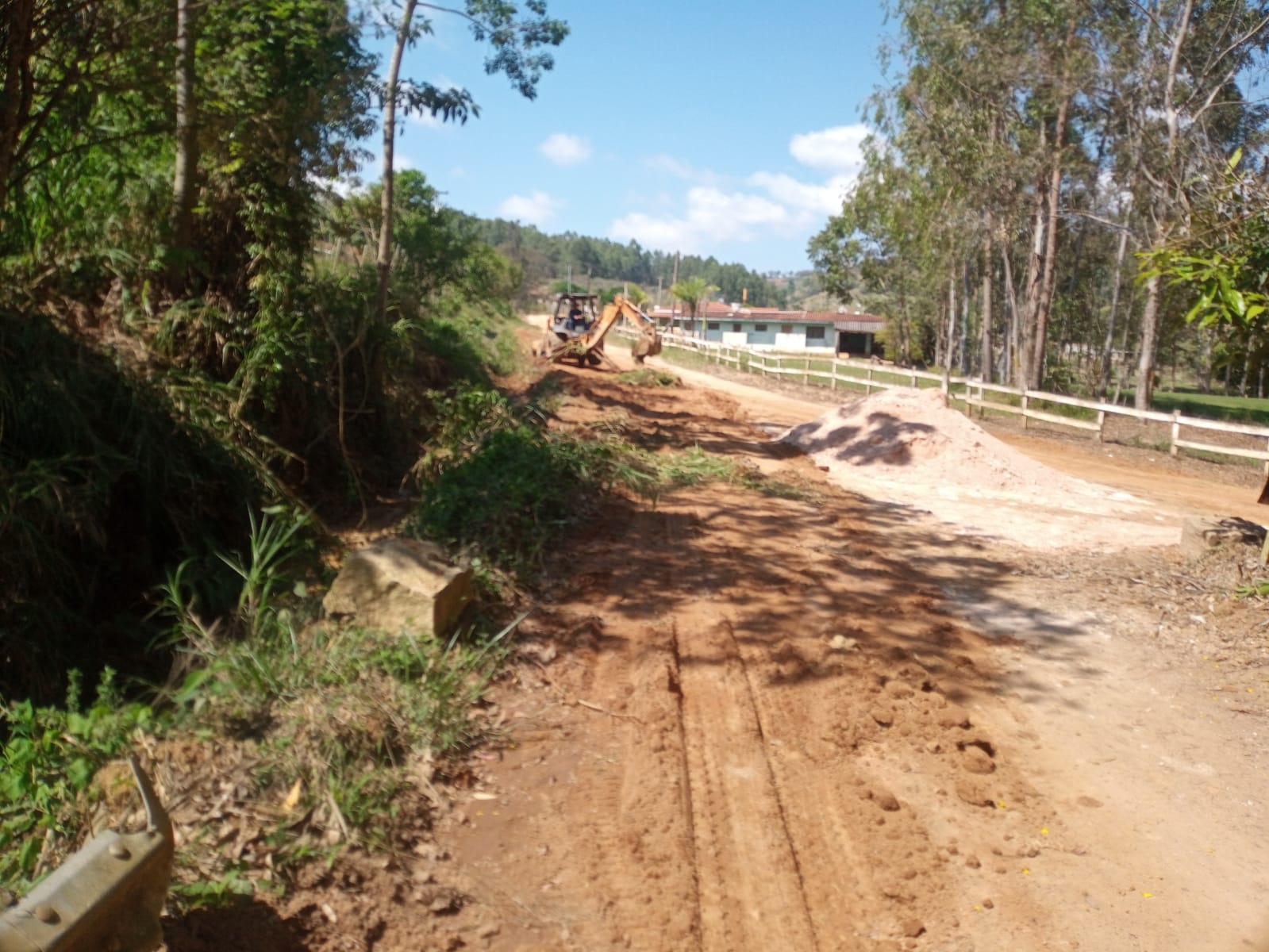 Na quarta-feira (05), parte da equipe de Manutenção de Estradas Rurais de Muzambinho trabalhou no aterro e compactação na estrada principal da Fazenda São José, ao lado do campo de futebol da comunidade. Também deu sequência na limpeza do dreno na lateral da estrada.