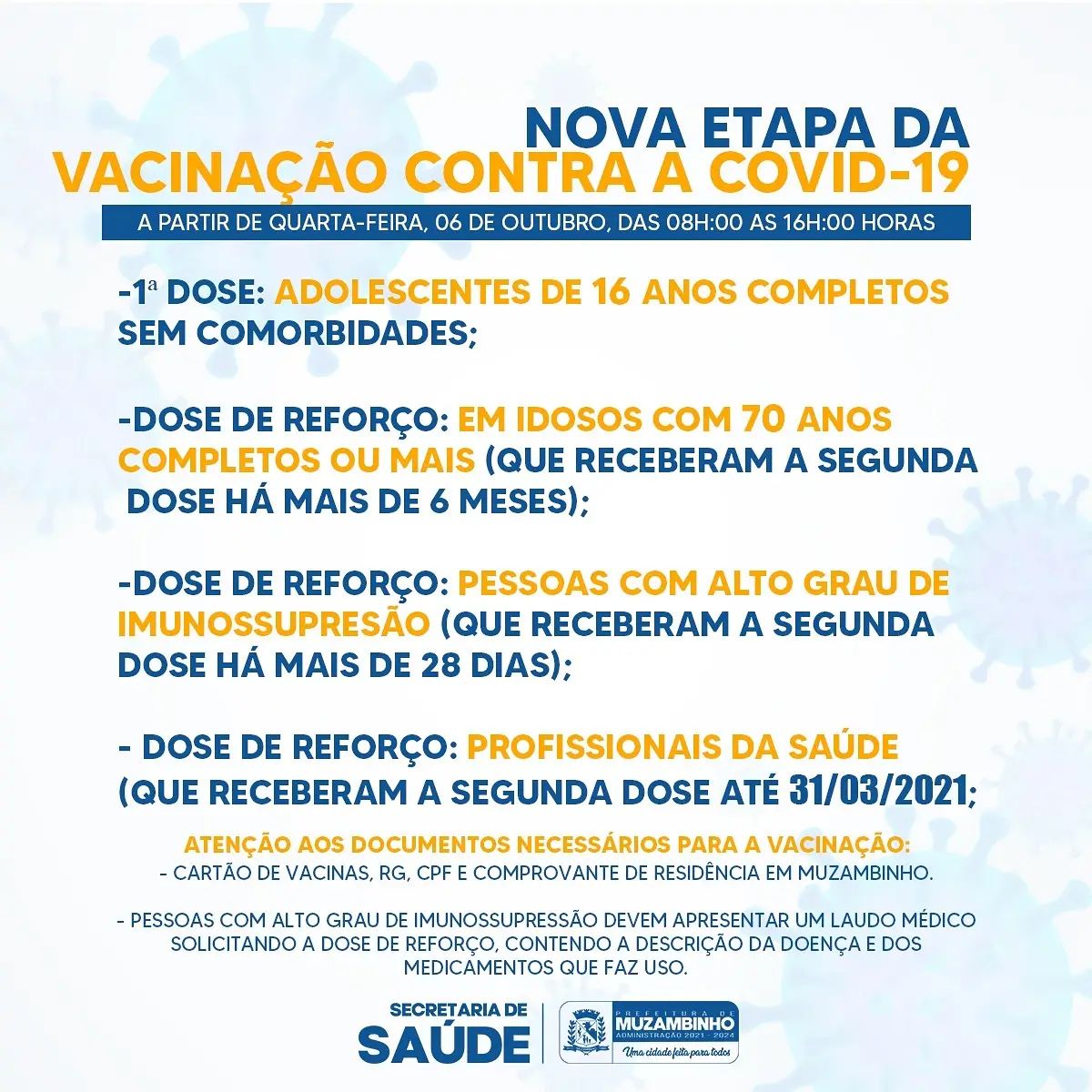 – DOSE DE REFORÇO: profissionais de saúde que atuam em Muzambinho e que receberam a segunda dose até 31/03/2021;