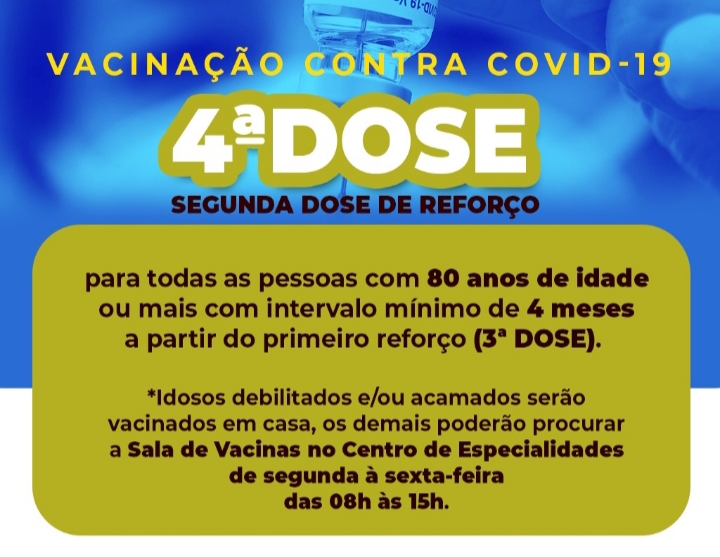 A 4ª dose é destinada a idosos que tomara dose de reforço (3ª Dose) com intervalo mínimo de 4 meses.