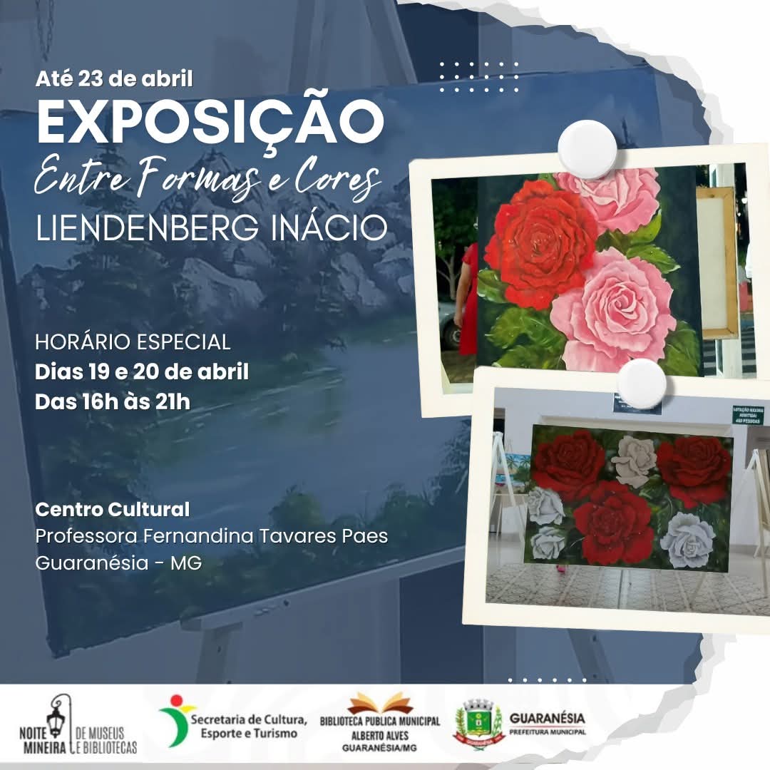 A arte e a criatividade seguem em destaque no Centro Cultural de Guaranésia com a exposição “Entre Formas e Cores”, do jovem artista Liendenberg Inácio. A mostra, que integra a programação da Noite Mineira de Museus e Bibliotecas, segue aberta à visitação até o dia 23 de abril, com entrada gratuita.